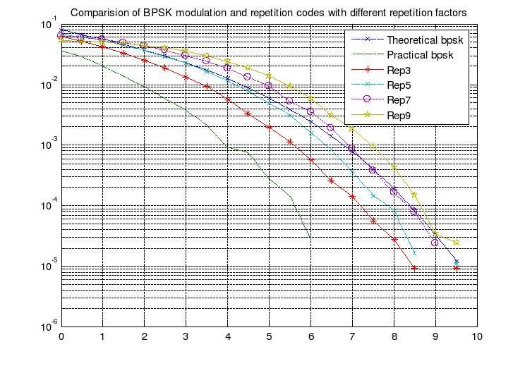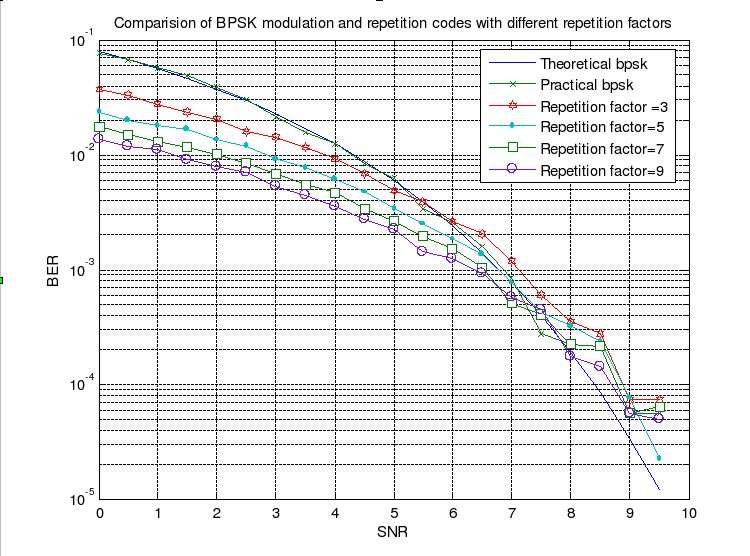 For fading channels repetition codes perform well with increasing repetition factor. In this figure, the coding gains for various repetition factors are seen.