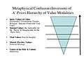 8) Pathological Ressentiment ultimately manifests as "Metaphysical Confusion". Metaphysical Confusion is a form of Value Delusion in which the value shift is more vertical in character,[36] in relation to the apriori hierarchy of value modalities. In this dimension, Value Delusion occurs a sort of twisting, or false inversion, of the value hierarchy wherein higher value-contents and bearers are viewed as lower, and lower as higher. Today we commonly refer to this phenomenon as "Having One's Priorities Out of Order." Scheler illustrated such an inversion in his analysis of Western civilizations humanistic, materialistic and capitalistic propensities to elevate utility values above those of vital values.[37][38] Carried to the logical extreme, "Ressentiment brings its most important achievement when it determines a whole "morality," preventing the rules of preference until what was "evil" appears "good".[39]