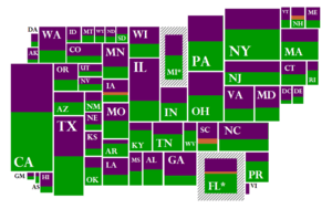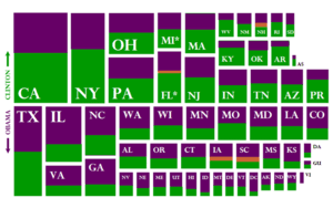 ![]() Pledged Delegates awarded in the Democratic primaries. Clinton won several larger states, while Obama established the delegate lead by winning more total states and winning his states by a greater average margin. States arranged geographically. |