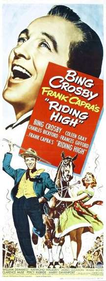 Riding High (1950) is a black and white musical racetrack film featuring Bing Crosby and directed by Frank Capra in which the songs were actually sung as the movie was being filmed instead of the customary lip-synching to previous recordings. The movie is a remake of an earlier Capra film called Broadway Bill (1934). While the film is generally a light musical comedy, it has an unexpected tragic turn in its story.[2]