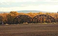 The Ririe A Pegram Truss Railroad Bridge is a Pegram truss railroad bridge which crosses the Snake River 3 miles (4.8 km) north of Ririe, Idaho. The bridge, which carries a one-track section of the East Belt Branch, consists of two truss spans and is 420 feet (130 m) long by 18 feet (5.5 m) wide. The bridge was originally constructed for a crossing in Nyssa, Oregon in 1894 for the Union Pacific Railroad and was relocated to its current site in 1914, where it carried Oregon Short Line Railroad tracks. The bridge's Pegram truss design was the work of George H. Pegram, the chief engineer for Union Pacific; as Pegram held a patent on the design, all surviving Pegram truss bridges were commissioned during Pegram's tenure with the Union Pacific and Missouri Pacific railroads.[2]