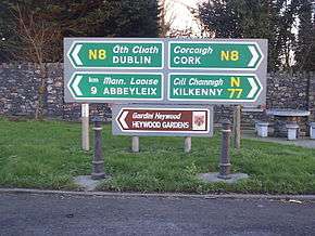 - ↑ "New road signs with parity for Irish may be introduced". Irish Times. 8 November 2013. Retrieved 7 May 2016.