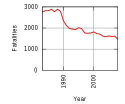 In 2010, 1367 people lost their lives in road traffic crashes in Australia.[1] While strategies to reduce road toll, including legislation, improvements to vehicle’s which help to make them safer, and educational programs have been developed by the national government, under the 1992 Road Safety Strategy, it is up to the local governments to adopt and enforce these policies.[2] The state of Victoria has implemented several initiatives such as speed camera, random alcohol breath tests, and an integrated state trauma system, which have successfully reduced the number of deaths caused by road traffic crashes.[3]