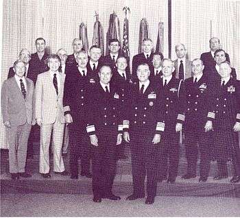 Front Row, left to right: Rear Admiral James Service, NWC President, and Admiral James D. Watkins, CNO.