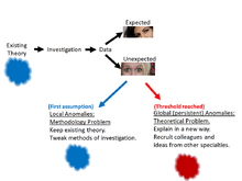 Dunbar and Fugelsang suggest that the process of discovery often starts when a researcher finds bugs in their experiment. These unexpected results lead a researcher to self-doubt, and to try and fix what they think is an error in their own methodology. The first recourse is to explain the error using local hypotheses (e.g. analogies typical of the discipline). This process is also local in the sense that the scientist is relatively independent or else working with one partner. Eventually, the researcher decides that the error is too persistent and systematic to be a coincidence. Self-doubt is complete, and so the methods shift to become more broad: The researcher begin to think of theoretical explanations for the error, sometimes seeking the help of colleagues across different domains of expertise. The highly controlled, cautious, curious and even social aspects of the scientific method are what make it well suited for identifying persistent systematic errors (anomalies).[1][7]