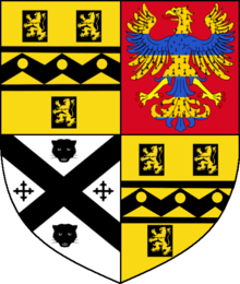 Quarterly: 1st and 4th, or, on a fesse, dancettée, with plain cotises between three billets, sa., each charged with a lion, rampant, of the field, as many bezants; 2nd, gu., an eagle, displayed, barry of six, erminois and az.; 3rd, or, a saltier, sa., in chief, a leopard's face, of the second.