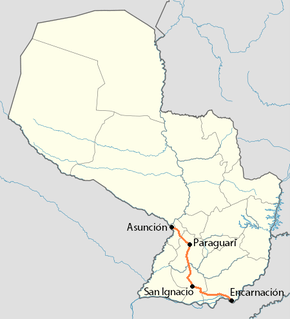 National Route 1 (in Spanish, Ruta Nacional Número 1 "Mcal. Francisco Solano López", or simply Ruta Uno) is one of the most important and one of the first highways in Paraguay, which runs from the capital city, Asunción to Itapua Department's capital, Encarnación. Crossing the departments of Central, Paraguarí, Misiones and Itapua. It starts on Avenida Eusebio Ayala, and ends at the San Roque González de Santa Cruz Bridge, on the Paraná River, traversing 370 km (230 mi).