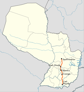 National Route 8 (officially, Ruta Nacional Número 8 "Dr. Blas Garay", simply known as Ruta Ocho) is a highway in Paraguay, which runs from San Estanislao to Coronel Bogado. It mainly connects the north and the south regions of the Oriental Region of Paraguay. It crosses five departments and has a total length of 320 km.