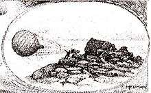 Free flight lasted for 10 hours and 29 minutes and was followed by another 41 hours of bumpy ride with frequent ground contact before the inevitable final crash.[30] The Eagle traveled for 2 days and 3½ hours altogether, during which time, according to Andrée, none of the three men got any sleep. The definitive landing appears to have been gentle. Neither the men nor the homing pigeons in their wicker cages were hurt, and none of the equipment was damaged, not even the delicate optical instruments and Strindberg's two cameras.[31]