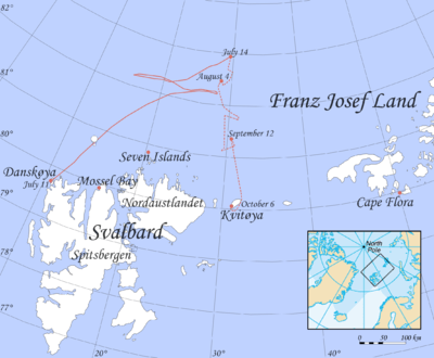 Starting out for Franz Josef Land to the south-east on July 22, the three soon found that their struggle across the ice, which had ridges two-stories high, was hardly bringing the goal any nearer: the drift of the ice was in the opposite direction, moving them backwards. On August 4 they decided, after a long discussion, to aim for Sjuøyane in the southwest instead, hoping to reach the depot there after a six- to seven-week march, with the help of the current. The terrain in that direction was mostly extremely difficult, sometimes necessitating a crawl on all fours, but there was occasional relief in the form of open water—the little boat (not designed by Andrée) was apparently a functional and safe conveyance—and smooth, flat ice floes. "Paradise!" wrote Andrée. "Large even ice floes with pools of sweet drinking water and here and there a tender-fleshed young polar bear!"[40] They made fair apparent headway, but the wind turned almost as soon as they did, and they were again being pushed backwards, away from Sjuøyane. The wind varied between southwest and northwest over the coming weeks; they tried in vain to overcome this by turning more and more westward, but it was becoming clear that Sjuøyane was out of their reach.[41]