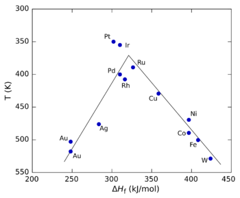 The figure on the right shows a volcano plot for the decomposition of formic acid using different transition metals as catalysts.[5] In this case, the heat of formation (ΔHf) of the metal formate salt was used for the x axis because studies showed that the reaction intermediate was a surface formate. For the y axis, the temperature at which the reaction reaches a specific rate was used (the y axis is plotted in reverse to preserve the conventional "volcano" shape). At low values of ΔHf, the reaction is slow (in other words, requires higher temperatures) because the rate of adsorption is slow and rate-limiting. At high values of ΔHf, desorption becomes the rate-limiting step. The maximum rate, which is observed for the platinum group metals in this case, requires intermediate values of ΔHf, with the rate being a combination of the rate of adsorption and the rate of desorption.[3]