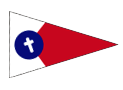 The signal flag of the Club shall be a pointed burgee, divided vertically by a swallowtail with the hoist white and the fly red; superimposed shall be a blue circle containing a cruciform cross of white at an angle of 45 degrees toward the hoist. The blue circle shall have a diameter of one-half the length of the hoist and the center thereof shall be placed at the point of the swallowtail nearest the hoist. The flag shall be made an inch in length for each foot overall lot the yacht flying this flag.