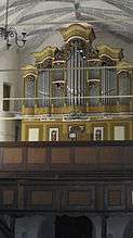 The large structure, built of quarried stone, is a hall church strengthened by 22 high buttresses. The nave is very wide and long, while the choir is closed on three sides. A brick defensive level was built above the choir, while there are two such levels above the sacristy's vaulted ceiling. These floors are accessed through two small brick towers on the western part of the church.[1] The defensive portion is slightly wider than the hall beneath. The nave ceiling, also vaulted, was rebuilt in 1878. The interior decor is mainly Baroque, with only the richly decorated choir pulpit being Gothic. Inscription fragments survive on the exterior walls.[2] Among the church's features are the two arched portals at the north and south sides, the upper windows with their delicate Gothic details, the Baroque altar and its floral decorations made of carved wood, and the 1786 organ.[4]