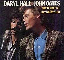 "Say It Isn't So" is a song by American duo Daryl Hall & John Oates written by Daryl Hall. It was released by RCA Records in October 1983 as the first of two new singles from their compilation album Rock 'n Soul Part 1, released that same year (see 1983 in music). The song was remixed as a "special extended dance mix" by John "Jellybean" Benitez, which topped Billboard magazine's Hot Dance Club Play chart.[2] The song peaked at #2 on the Billboard Hot 100 for four weeks, coincidentally behind "Say Say Say" by Paul McCartney and Michael Jackson.