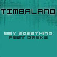"Say Something" is a song recorded by American producer, songwriter and rapper Timbaland, for his third studio album Shock Value II (2009). The song features vocals from Canadian rapper Drake. It was written by Mosley, Jerome Harmon, Graham, Timothy Clayton and John Maultsby. The production was helmed by Mosley under his stage-name Timbaland while Harmon served as the assistant producer, under the stage-name Jroc. The song was tailored to Drake's sound and when the rapper wrote to it, he contacted the producer about the lyrics. Despite the verses feeling more like Graham's record, Mosley gave his blessing and went the product. The song was solicited to digital retailers on November 3, 2009 in the United States as the album's second single.