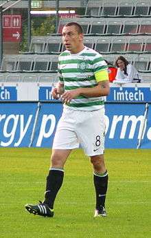 Brown was booked in Celtic's penultimate league game against Kilmarnock, which caused him to go over the disciplinary points threshold and receive a suspension for the first two matches of the 2011–12 season.[84] Brown helped Celtic to the 2011 Scottish Cup Final, which Celtic won 3–0 against Motherwell. This allowed him to collect his first trophy as Celtic captain.[85] Brown played 39 times for Celtic, scoring four goals, during the 2010–11 season.[86] He was often used on the right of midfield, partly due to the form of other central midfielders such as Beram Kayal, Joe Ledley and Ki Sung-Yueng, but also because Brown is more able to play in wide areas than them.[87]