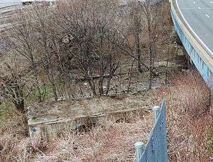 This station was built extending from the tunnel entrance to Jerome Avenue on the side of a cliff on a steel structure spanning the tracks of Metro-North's Hudson Line that connected to the existing Putnam Bridge, which had been built for the New York City and Northern Railroad. The station street entrance and mezzanine was above the tracks on Sedgwick Avenue. The west end of the platforms on the steel structure were constructed of wood. The east end of the concrete platforms extended into the tunnel for about a car length. A connecting passageway and stairways from the west end of the northbound platform led to the platforms on the New York Central Hudson Division tracks to permit transfers to that division's trains.[3] The station site, in 2010, has ruins of the platforms and the track-bed into the tunnel entrance on Sedgwick Avenue.