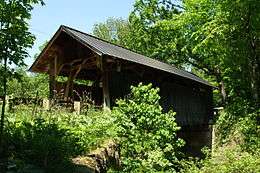 The Seguin Covered Bridge, also called the Upper Covered Bridge and the Sequin Covered Bridge,[2] is a wooden covered bridge that crosses Lewis Creek in Charlotte, Vermont on Roscoe Road. It was built about 1850, and is a distinctive variant of a Burr arch design. It was listed on the National Register of Historic Places in 1974.[1] It has been closed for rehabilitation through the late summer and fall of 2016.