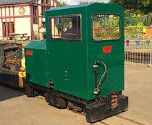 In December 1929, a 4 ft 8 1⁄2 in (1,435 mm) standard gauge 0-6-0 diesel locomotive was obtained to work the Ravenglass-Murthwaite section. It was built by Kerr Stuart (works number 4421) and had a six-cylinder, 90 horsepower (67 kW), McLaren-Benz engine. Transmission was mechanical and final drive was by roller chains. In 1955 it was sold, through a dealer, to the National Coal Board for use at Wingate Grange Colliery, Durham. A new Dorman engine of 90 horsepower (67 kW) was fitted in 1960.[5] It is now preserved at the Foxfield Light Railway,[6] restored to original external condition, and was displayed at Ravenglass in the summer of 2000.