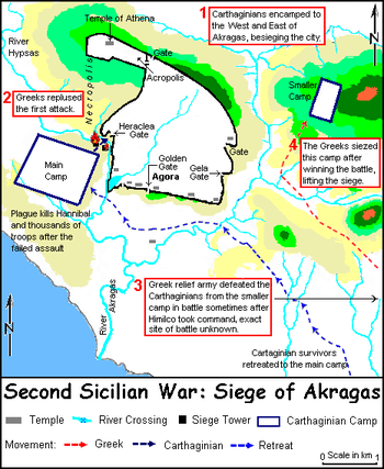 The Siege of Akragas took place in 406 BC in Sicily; the Carthaginian enterprise ultimately lasted a total of eight months. The Carthaginian army under Hannibal Mago[1] besieged the Dorian Greek city of Akragas in retaliation against Greek raids on Punic colonies in Sicily. The city had managed to repel Carthaginian attacks until a relief army from Syracuse defeated part of the besieging Carthaginian army and lifted the siege of the city.