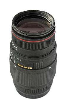 The Sigma 70-300mm F4-5.6 APO DG Macro lens is a consumer-level, telephoto zoom lens made by Sigma Corporation.[1] Different versions of this lens are produced that work with cameras from Canon, Nikon, Pentax, Konica Minolta, Sony and Sigma. Additionally, Olympus' 70–300 f/4–5.6 lens for Four-Thirds has the same optical design and specifications as this lens. The lens is packaged with a lens hood.