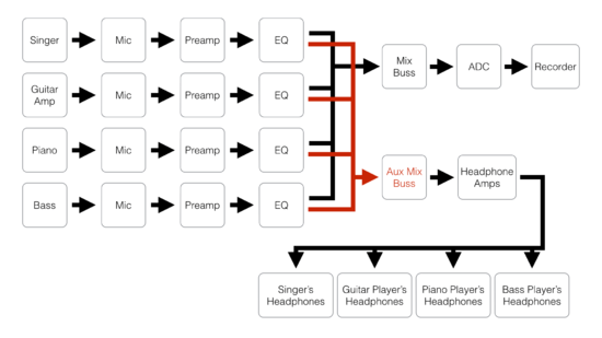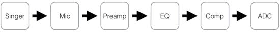 The exact series of elements in a signal flow will vary from system to system. The following example depicts a typical signal flow for recording a vocalist in a recording studio.