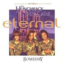 "Someday" is a song from Disney's 1996 animated feature film, The Hunchback of Notre Dame. It was written by composer Alan Menken and lyricist Stephen Schwartz and originally recorded by American singer and actress Heidi Mollenhauer in her film role as the singing voice of Esmeralda. It was one of three recordings, along with "In a Place of Miracles" and "As Long as There's a Moon", that were discarded during the storyboarding process to be replaced by "God Help the Outcasts." The directors Gary Trousdale and Kirk Wise both desired a quieter song for Esmeralda's scene inside Notre Dame cathedral. While not featured in the body of the film, a cover of "Someday" is heard over the closing credits.[1]