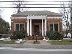 The Southampton Center Historic District encompasses the densely built center of the otherwise predominantly rural town of Southampton, Massachusetts. The district extends from Former Road in the south, along High Street and College Highway (Massachusetts Route 10) to Maple Street, and includes a line of houses along East Street from College to Elm. This area is the historic heart of the town, being first laid out in the 1730s. The district includes (in addition to a number of 18th- and 19th-century residences) several church buildings, the town hall, and the old public library.[2] The district was listed on the National Register of Historic Places in 1991.[1]