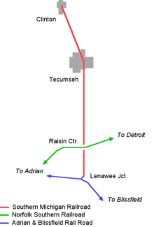 The railroad runs 13.5 miles (21.7 km) from Clinton, Michigan, through Tecumseh, Michigan, to Lenawee Junction, Michigan. This line is the second railroad constructed in the State of Michigan, and the first branch line. It was originally the Palmyra and Jacksonburgh Railroad, running between Palmyra (near Lenawee Junction) and Jackson, Michigan.