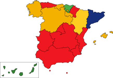 | Regional administrations after the 1987 elections. ■ – PSOE ■ – AP ■ – CDS ■ – CiU ■ – PNV ■ – PAR | |||||||||||||||||||||||||||||||||||||||||||||||||||||||||||||||||||||||||||||||||||||||||||||||||||||||||||||||