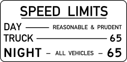 Non-passenger vehicles in excess of thirteen tons, or "vehicles drawing a pole trailer" weighing more than 3 tons may not exceed 65 mph unless signs are posted that allow such a speed. Yet this does not differ from the default speed limit, and has the practical effect of requiring extra consideration for posting a standard speed limit sign in excess of 65 mph.[4] A non-numeric minimum speed limit is incorporated with the basic speed rule in Arizona, which also prohibits speeds higher than would be "reasonable and prudent".[3]