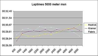 - Hedrick took the lead by eight tenths out of his first outer curve, and just extended that lead, as de Jong could only keep below 30 on his first full lap and ended with 6:22.12. Hedrick had caught up with Kramer by 1,400 metres after laps of 29.5, 29.3 and 29.2 seconds, and his six next laps were also below 30, as he took a lead of 2.5 seconds with three laps to go. He lost somewhat towards the end, and a last lap of 30.70 prevented him from skating under Jochem Uytdehaage's Olympic record of 6:14.66; he finished 0.02 seconds behind it.