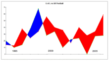 A 2006 Lexington Herald-Leader article stated that interest in UofL sports is surging across the state of Kentucky, especially in Hopkinsville and Owensboro.[4] An October 21, 2006 Louisville Courier-Journal article also stated that the total sales of UofL merchandise has tripled since 2001 and that the school now ranks 32nd nationally in sales, up from 41st in 2001. UofL ranks 2nd in the Big East Conference and the 3rd highest among all urban universities (to Southern California and Miami) in merchandise sales. UK's merchandise sales have steadily remained around 14th in the nation, by far the best in the state. UofL now has more registered collegiate license plates than the University of Kentucky (18,300 to 17,000); a fourfold increase since 2004. In 1995 UK had a 15,000 plate lead on UofL.[5] It is also important to note that in the last few years the Louisville Cardinals have been the most profitable college sports franchise in the nation and have been deemed to have the most equitable fanbase of any school in the country according to a few studies.