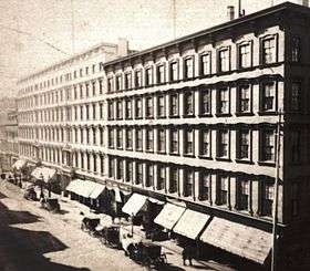 The corner of Spring Street and Broadway was the location of the St. Nicholas Hotel, a six-story, marble-faced, 600-room luxury establishment that was designed by either J. B. Snook or Griffith Thomas,[8] and was completed in 1853. It was equipped with the newest technological conveniences, such as central heating, hot running water, and a telegraph office in the lobby. The interior of the hotel featured frescoes on the ceiling, gas light chandeliers and walnut wainscotting. The opulence of the hotel was such that one visitor described a stay there as: "like an introduction to the palace of some Eastern prince."[23] The building took up the full block between Spring and Broome Streets; only two small segments survive.[8][24][25]