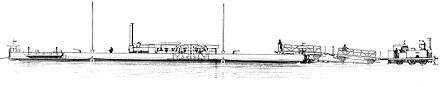 The ferry pontoons for carrying rail wagons were not able to navigate freely on the river, but instead were attached to two cables that were stretched across the river upstream of the ferry. Successful operation of the train ferry was only achieved when the original chains were replaced with stronger cables. The ferry was attached by a cable to another cable that ran over the river to resist the current and to serve as a guide rope. A thinner cable ran through the water on to two wheels on the ferry that were powered by a steam engine; the ferry hauled itself across the river by pulling on the cable.