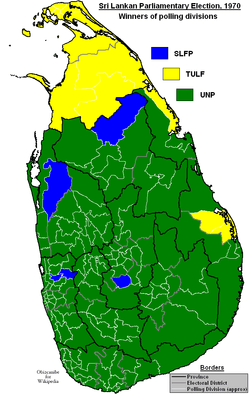 | Winners of polling divisions. UNP in green, TULF in yellow and SLFP in blue. |