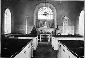 After Rev. Evans' departure, the Welsh-speaking Anglicans of Radnor sent the Society a 100-signature petition requesting a shipment of Welsh-language prayer books and Bibles, and especially requesting another Welsh-speaking missionary. A complete response was apparently slow in coming; ten years later, upon meeting their new leader, the parishioners “heartily engaged themselves to build a handsome stone church to be named after the Patron Saint of Wales”. The cornerstone of the new building was laid on May 9, 1715.[7][8] In an unusual expression of solidarity between denominations, several other clergymen assisted with the laying of the foundation, including Pastor Sandel of Old Swedes Church in Philadelphia.[9] The first worship services took place in the new church on Christmas Eve, 1715.[5] The building still stands, and seats 100 in old-fashioned box pews; the current organ is not original, having been built in 1952.[10]