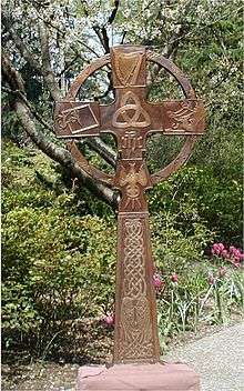The artist, Lycia Danielle Trounton, created a Celtic cross design to bring out these aspects of Dunstan's life: (1) musician, (2) illustrator or illuminator of manuscripts, and (3) metalworker, blacksmith or farrier (a person who shoes horses). Then, these ideas were complemented with a central image of the Holy Spirit as a dove. The picture of the cross before mounting shows the imagery used clearly.