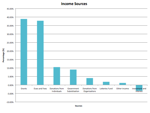 In the financial year 2008–2009, the organisation generated income of $339,484,185.14 and the dominant income sources are from Grants and Dues and fees and the organisation has a 3.38% reduce in income from Investments and interest.