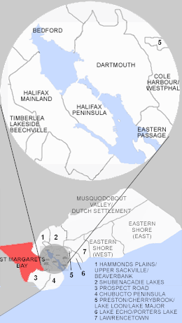 | Communities | Black Point, Boutiliers Point, French Village, Glen Haven, Glen Margaret, Hackett's Cove, Head of St. Margarets Bay, Hubbards, Hubley, Indian Harbour, Ingramport, Lewis Lake, Peggys Cove, Queensland, Seabright, Simms Settlement, Tantallon, Upper Tantallon |