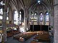 The church furnishings were damaged from British and American bombing raids in August 1944, as well as, as far as the stained glass windows are concerned, from a violent hailstorm in 1958,[4] incidentally the same hailstorm that destroyed most of the Botanical Garden's historical greenhouses. The most outstanding feature inside is the main tribune pipe organ of 1897 (modified in 1934 and restored several times since), also classified as Monument historique.[5] This is, by the number of pipes and registers as well as by the sheer size of the organ case,[6] one of the largest instruments in Alsace and most probably Eastern France. In 1976, a second pipe organ was installed in the transept.