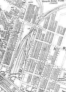 The Liverpool, St Helens and South Lancashire Railway, which ran from a junction with the Wigan Junction Railways (WJR) to the north of Lowton St Mary's,[4] opened for goods and mineral traffic in 1895, but passenger services did not commence until January 1900.[5] The formal opening was on 2 January[6] with public services beginning the following day,[7] being operated by the Great Central Railway,[4] which was already operating the WJR.[8] Most services ran through to Manchester Central.[9] The station opened with the commencement of public passenger services on 3 January 1900 and was originally named St Helens.[10]