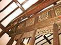 In 2011 the medieval carved screen of c.1500, originally from St Mary’s church in Newtown, was re-positioned in Llanllwchaiarn church. Fenton thought the screen was perhaps the most perfect thing of the kind in the kingdom and the Rev John Parker described it in 1829 as a world of Gothic art…..with the highest luxuries of workmanship and colouring. The largest part of the screen to survive is a length with five bays to either side of the Tudor arched door, its spandrels with cusped circles. Double ogee tracery heads make an inventive display of circles, quatrefoils and wheels. The bressumer has intricate trails of running ornament, incorporating leaf designs, together with flower, vine, pomegranate and seaweed.the carving is still coloured in gold, red and green. A section of coving is also preserved, with its elaborate panels and drop scrolling.[4]