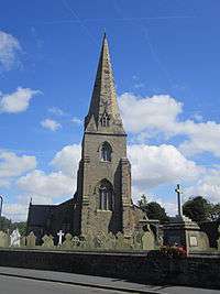 The church is built in coursed sandstone rubble, and it has slate roofs. Its architectural style is simple Decorated Gothic.[5] The design of the church was influenced by Pugin.[1] Its plan consists of a nave, north and south full-height four-bay aisles, a north porch, a chancel with a transeptal chapel to the south and two offices to the north, and a west steeple. The steeple consists of a three-stage tower with angle buttresses and a broach spire. In the middle stage of the tower is a three-light west window, and the top stage contains a two-light window on each side. Between the broaches of the spire are gabled lucarnes containing louvres. The windows along the side of the aisle have two lights.[5]