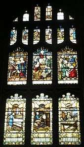 Pevsner describes the reredos and altar designed by Austin and Paley as "extremely handsome" and "gorgeously painted" in gold, red and green by Shrigley and Hunt.[10] Stained glass windows installed between 1887 and 1933 in the Lady chapel, south aisle and several in north aisle are also by Shrigley and Hunt while others including the east window are by Charles Eamer Kempe.[2] The Speakman window is of interest as it depicts scenes from the industries on which Leigh was built, panels include weavers, engineers and colliers.[15]