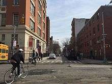 Stanton Street is a west-to-east street in the New York City borough of Manhattan, in the neighborhood of the Lower East Side. It begins at the Bowery at the corner of the infamous Sunshine Motel. This three-lane street, with a bike lane, a parking lane, and a through lane, is one block north of Rivington Street and one block south of Houston Street. Automotive traffic runs eastward to Pitt Street, after which it dead-ends into a pedestrian pathway.