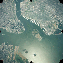Ellis and Liberty Islands (bottom center) in Upper New York Bay at the mouth of the Hudson River (left) near Liberty State Park