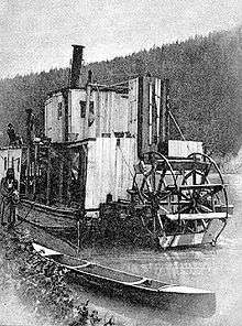 Another competitor was Captain Tom Powers, of Tobacco Plain, Montana who traded 15 cayuse horses for the machinery to build a small steamer near Fort Steele, which was called Fool Hen.[21] The machinery was too large for Fool Hen and there was no room for freight. Powers used discarded wooden packing cases from Libby merchants to make his paddlewheel buckets, so that as the steamer churned down the river, the merchants' names rotated again and again as the wheel turned. Shortly after Fool Hen was finished, Powers then removed the engines and placed them in a new steamer, the Libby. This time the engines proved to be too small for the hull, and Libby was used only sporadically in 1894 and 1895.[1][18]