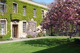 Regent's Park College is located just off of St Giles' in the heart of Oxford, near to other colleges St Cross College and St John's College. The site is based around a large neoclassical quadrangle (as seen in the adjacent picture). The quadrangle is well known for the extensive virginia creeper which covers most of the buildings. On the south side of the quad is the college entrance and lodge. On the west side is the Hall, with two Ionic columns flanking the main entrance to the room. The names ‘Thomas Helwys’ and ‘William Carey’ are carved on either side of the glass door leading into the Hall. Thomas Helwys was a religious refugee in Holland and returned to England to start the first Baptist church. Carey was a missionary to India and inspired the foundation of the Baptist Missionary Society in 1792.[10]