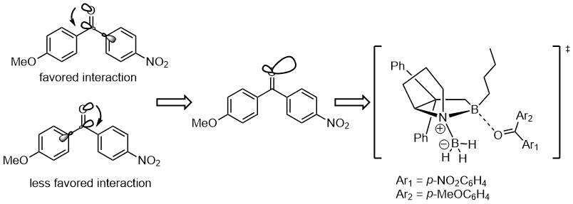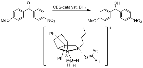 The other substituents on the benzene ring can also affect the electron density on the aromatic ring and in turn influence the selectivity. In the hydrogenation of ketones using CBS catalysts, the ketone coordinate to the boron atom with the lone pair on the oxygen atom. In the following example, the substituent's influence can be passed to differentiate the two lone pairs on the oxygen atom.[11]